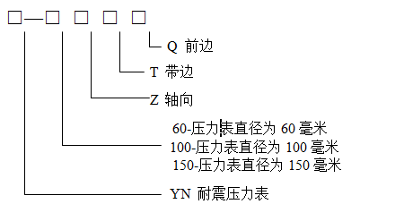 例:YN-100ZTQ 0-1MPa 代表直徑為100毫米、軸向帶前邊測壓范圍0-1MPa的耐震壓力表