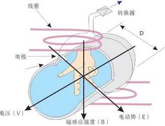 測量流量時(shí),導(dǎo)電性液體以速度V流過垂直于流動(dòng)方向的磁場,導(dǎo)電性液體的流動(dòng)在測量電極上感應(yīng)出一個(gè)與平均流速成正比的電壓,由此可以得出通過管道的體積流量為: