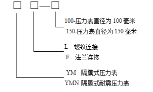 例:YMNF-100  0-1MPa   為壓力表直徑100毫米、測量范圍0-1MPa法蘭連接的隔膜耐震壓力表